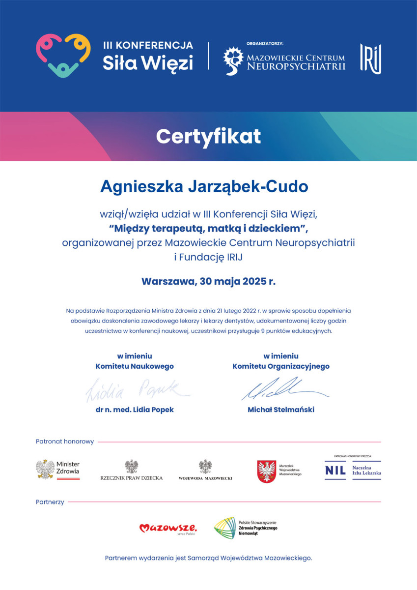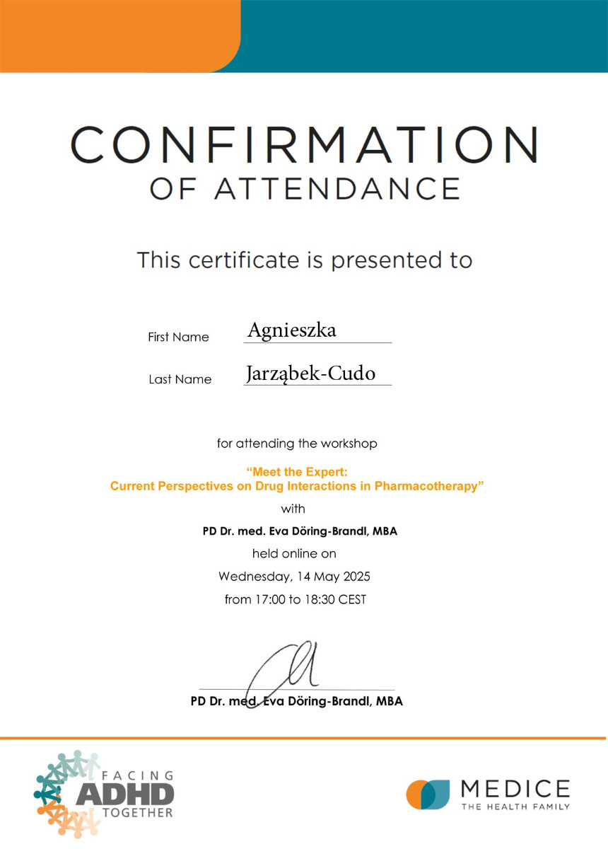 Regularnie uczestniczę w specjalistycznych szkoleniach i konferencjach, aby stosować najnowsze, sprawdzone metody leczenia psychiatrycznego dzieci i młodzieży, zgodne z międzynarodowymi standardami.