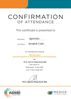 Udział w warsztatach „Poznaj eksperta: Aktualne perspektywy dotyczące interakcji leków w farmakoterapii” z PD Dr. med. Evą Döring-Brandl, MBA. Warsztaty odbywały się online.